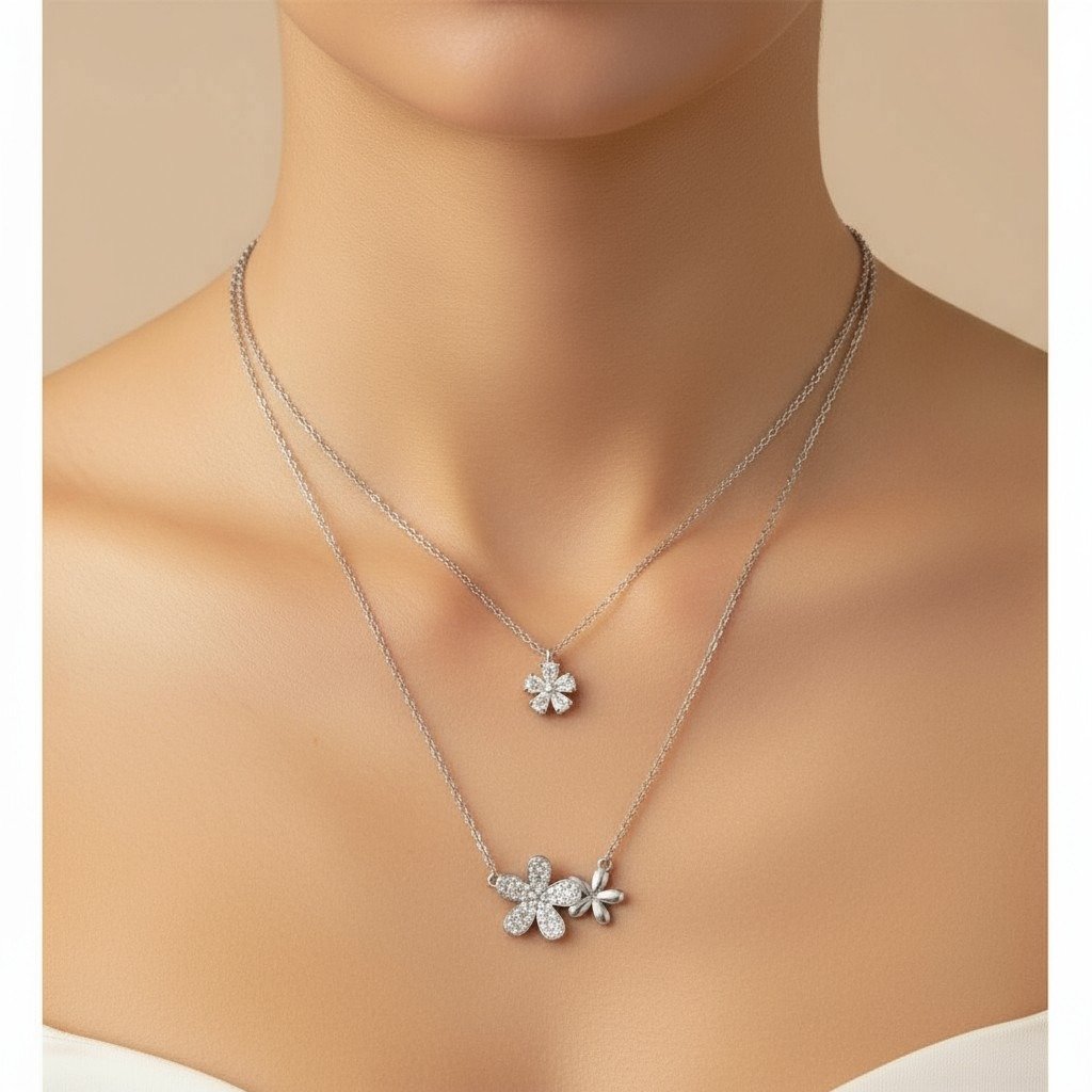 🌸 قلادة نسائية من الفضة بتصميم ورود مزينة بالزركون ✨