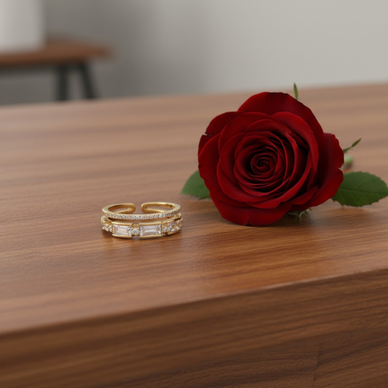 💍 خاتم رقيق بتصميم ثنائي مطلي بالذهب ومرصع بالكرستال اللامع