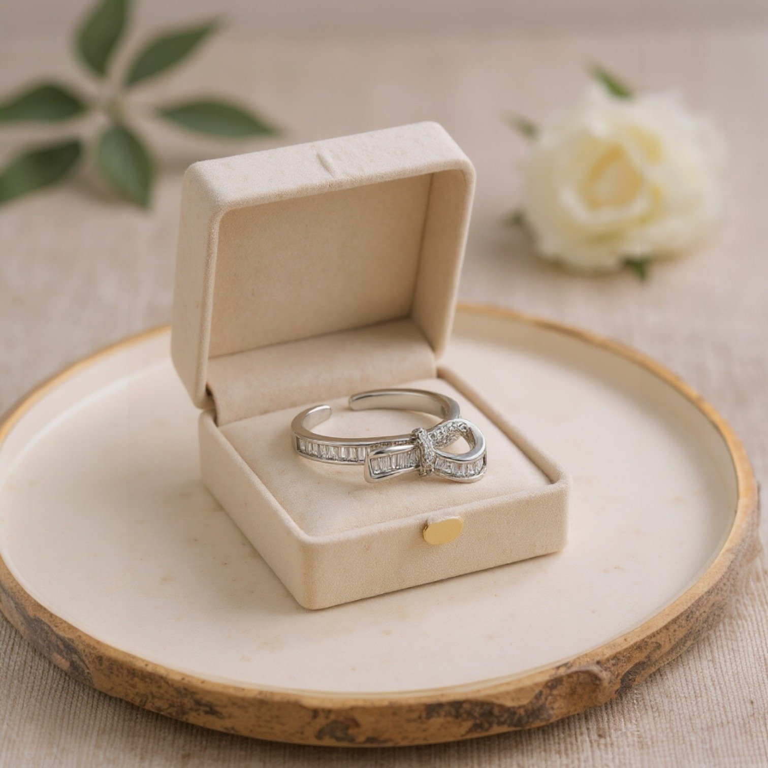 أضيفي لمسة من الأنوثة والرقي إلى إطلالتك مع هذا الخاتم الأنيق المصنوع من الفضة اللامعة والمصمم بشكل فيونكة ناعمة تعبّر عن الجمال والبساطة في آنٍ واحد.