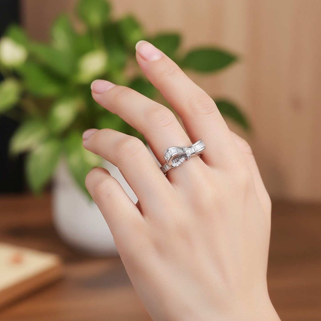 🎀 خاتم نسائي من الفضة بتصميم فيونكة مزين بالزركون